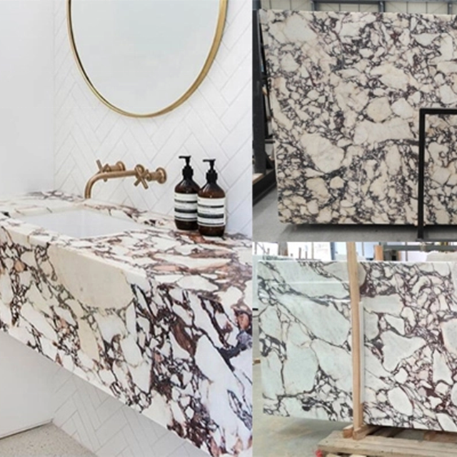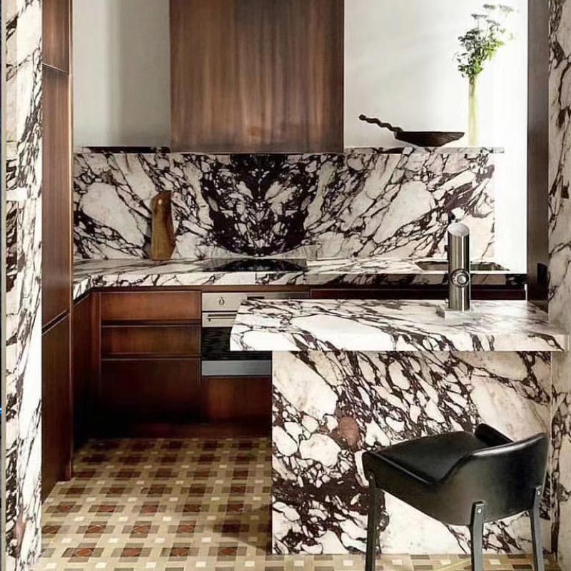 Calacatta Viola Polished Marble is an off-white marble tile with striking purple veining. Viola is vivid and elegant with beautiful burgundy veining